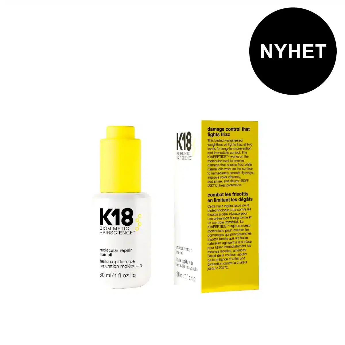 K18 Molecular Repair Hair Oil 30 ml En vektløs og silikonfri olje som: reparerer skader, bekjemper frizz, kontrollerer flyaways, gir glans, reduserer slitte tupper og er varmebeskyttende opp til 232 °C